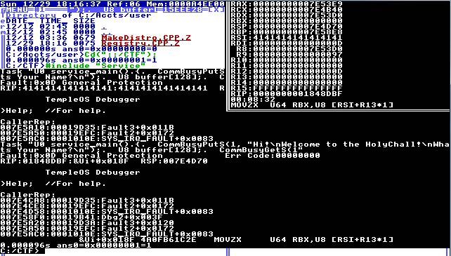 So at first this looks pretty terrifying (unknown OS/API/etc), but it turns out the local image was compiled with TempleOS system debugger, which actually is pretty awesome! It's like a C (well, HolyC actually) scripted SoftICE - when you sent the name as e.g. "A"*256 (and so crashed the app), you would instantly be put in the debugger and could see the registers, play with memory, read addresses, etc (that being said, it did change the context to some other process).